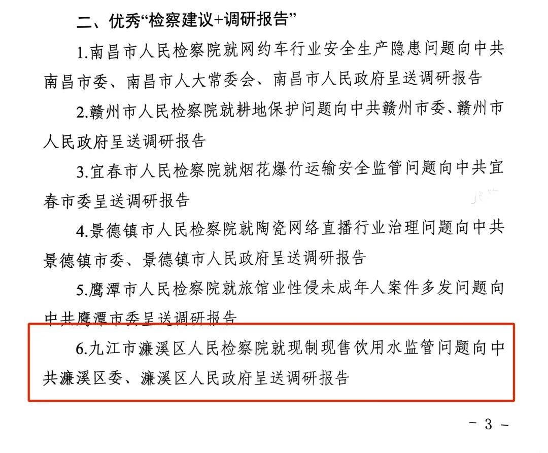 江西省人民检察院印发《关于2023年度全省检察机关优秀社会治理检察建议暨“检察建议+调研报告”评选结果的通报》,九江市濂溪区人民检察院就现制现售饮用水监管问题向党委、政府呈送调研报告获评2023年度全省检察机关优秀“检察建议+调研报告”。